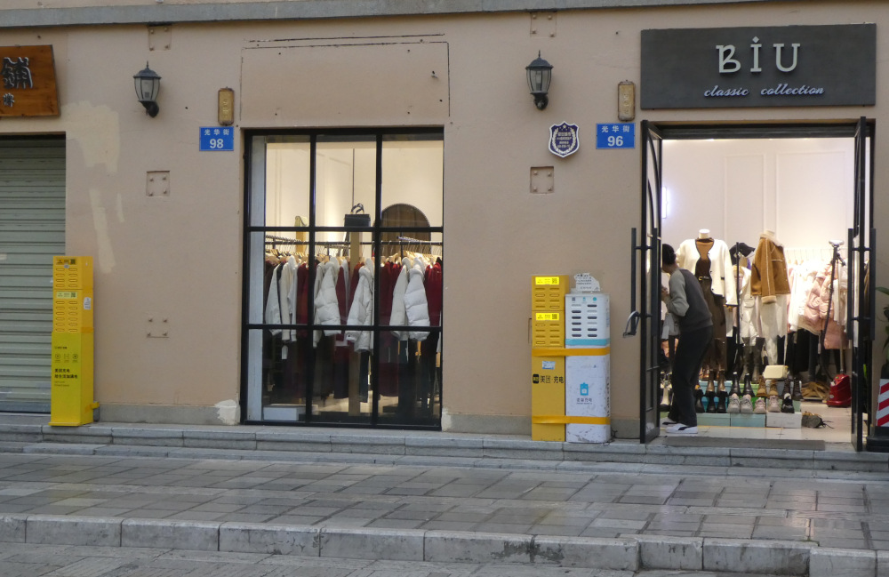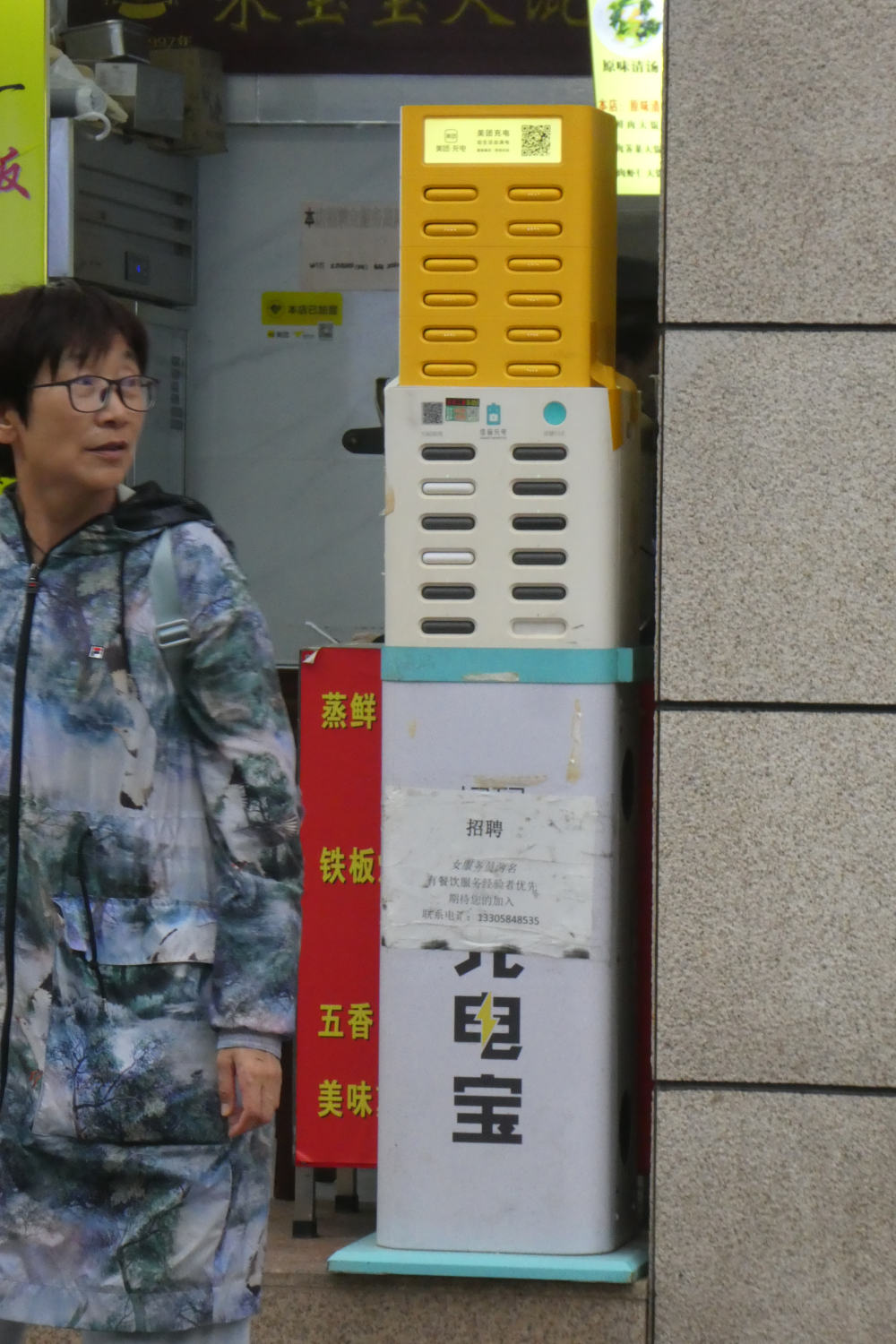 Ce sont des banques de batteries portables. En montrant à la machine le QR code de son compte, on peut prélever une batterie et l’emporter pour recharger son téléphone. Une fois cela fait, il suffit de remettre la batterie dans une autre banque en ayant fait à nouveau flasher son QR code. On sera alors débité du montant de la location, proportionnelle à la durée de l’emprunt, quelques yuans.