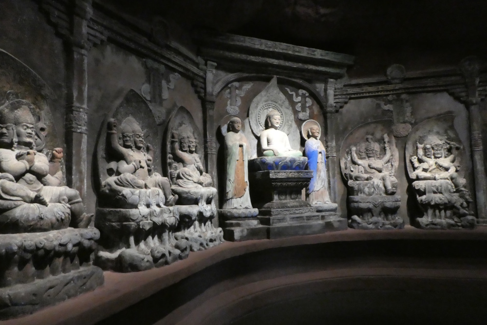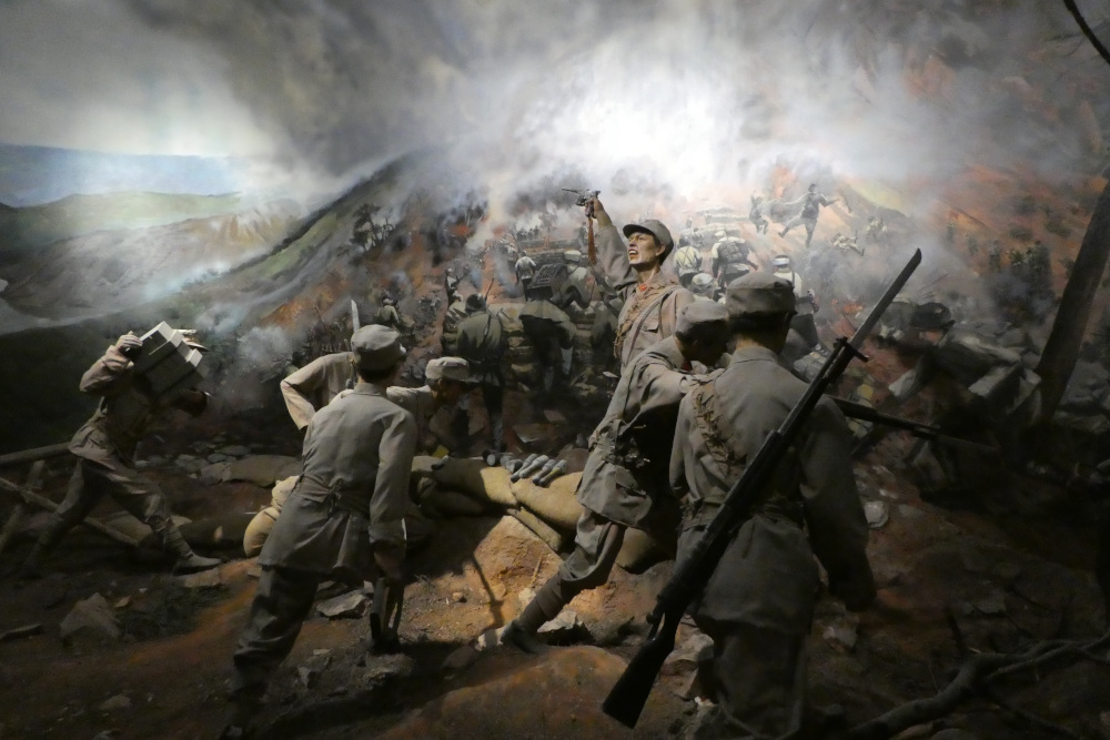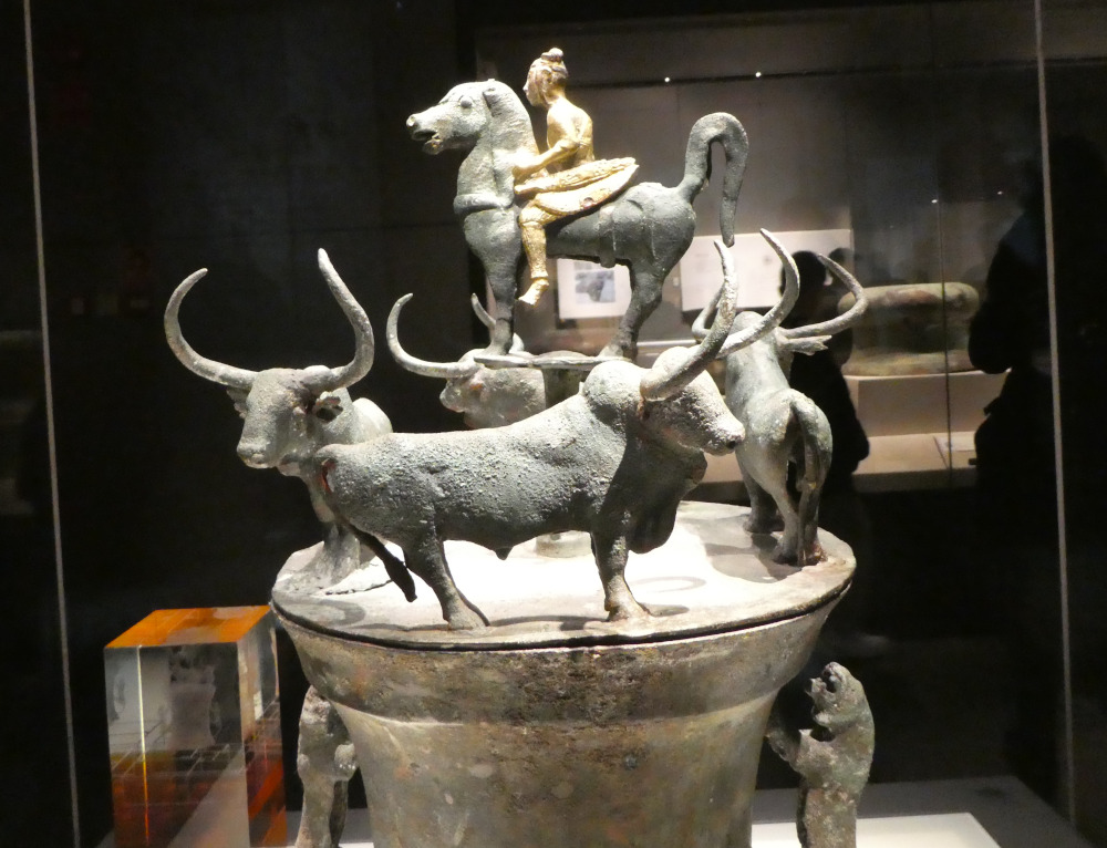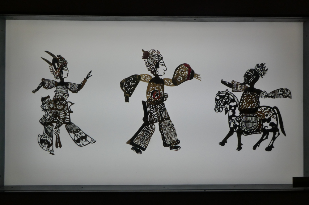[4] De gauche à droite dans l’aperçu des œuvres : 1/ Conteneur en bronze surmonté de figurines : chevalier en or et quatre taureaux, Dynastie Han (206 avant JC – 8 après JC) 2/ Grotte des huit rois sages 3/ Couronne en or, Dynastie Ming (1368-1644) 4/ Marionnettes d’ombre 5/ Contre attaque contre les Japonais dans l’ouest du Yunnan (1943)