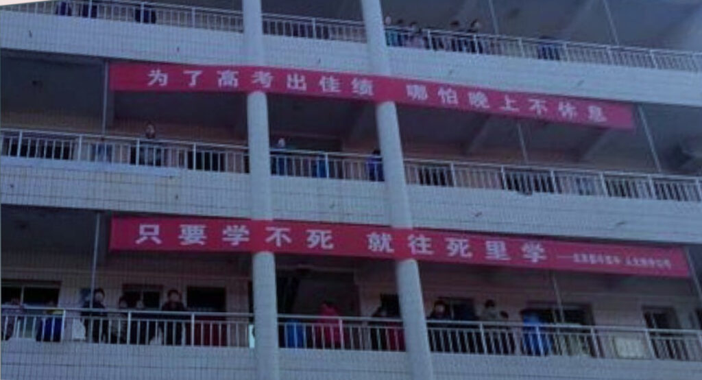 En guise de conclusion, voici deux slogans affichés dans des écoles chinoises que notre professeur est allée chercher sur internet, pour nous montrer combien était stimulé l’esprit de compétition dans les études. Le premier déclare : « améliorer son score d’un point, c’est tuer mille candidats » (la notation est sur 100 points) ; le deuxième : «  Tant qu’étudier ne te tue pas, étudie à en mourir »…