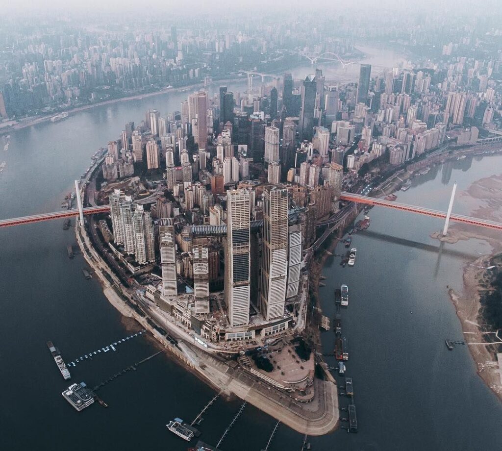 La ville ancienne était une forteresse naturelle et un port reliant, grâce au fleuve bleu, la riche province du Sichuan à la Chine orientale. Mais de cette ville ancienne, il ne reste rien ou presque [12]. Des immeubles de grande hauteur ont poussé un peu partout et rapidement, pour pouvoir loger les populations aspirées par elle. De jour, ils sont plutôt moches. Elle n’a à offrir que des curiosités de sa modernité, comme cet immeuble que le métro traverse, un téléphérique passant au-dessus du fleuve bleu ou une sorte de marché nocturne dévalant une colline abrupte en 11 niveaux successifs jusqu’au Jīalíng [13].
