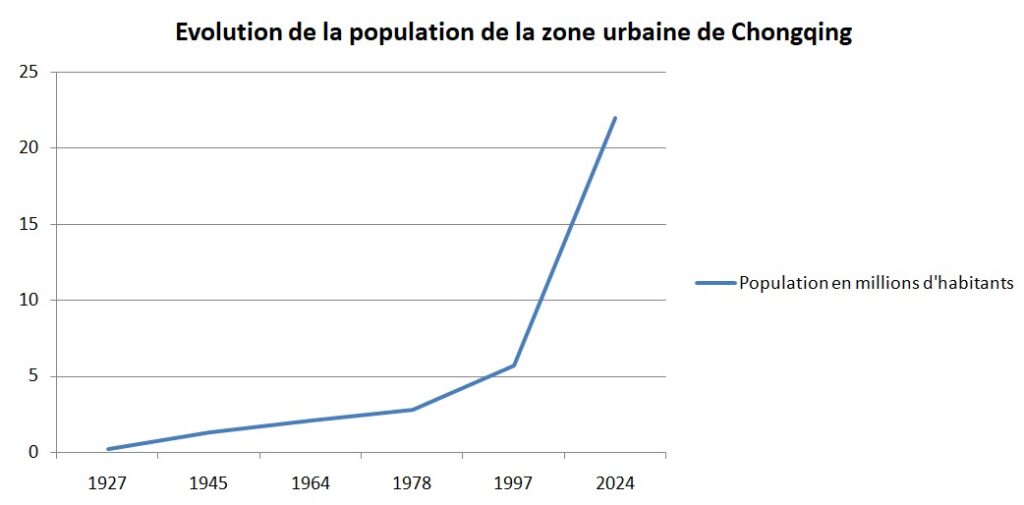 Dans les années 1930, elle n’avait encore que 200 000 habitants. C’est la guerre sino-japonaise (1937-1945) qui conduisit à sa première croissance démographique. Elle était en effet devenue la capitale provisoire de la Chine de Tchang Kaï-chek et le seul bastion à avoir résisté jusqu’au bout à l’invasion japonaise. A la fin de la guerre, malgré les bombardements, elle comptait plus d’un million d’habitants. Mais c’est son changement de statut intervenu en 1997 et l’industrialisation fulgurante qui l’a accompagné, qui lui a permit d’atteindre les sommets actuels, comme le montre ce tableau gracieusement fourni par mon robot conversationnel.