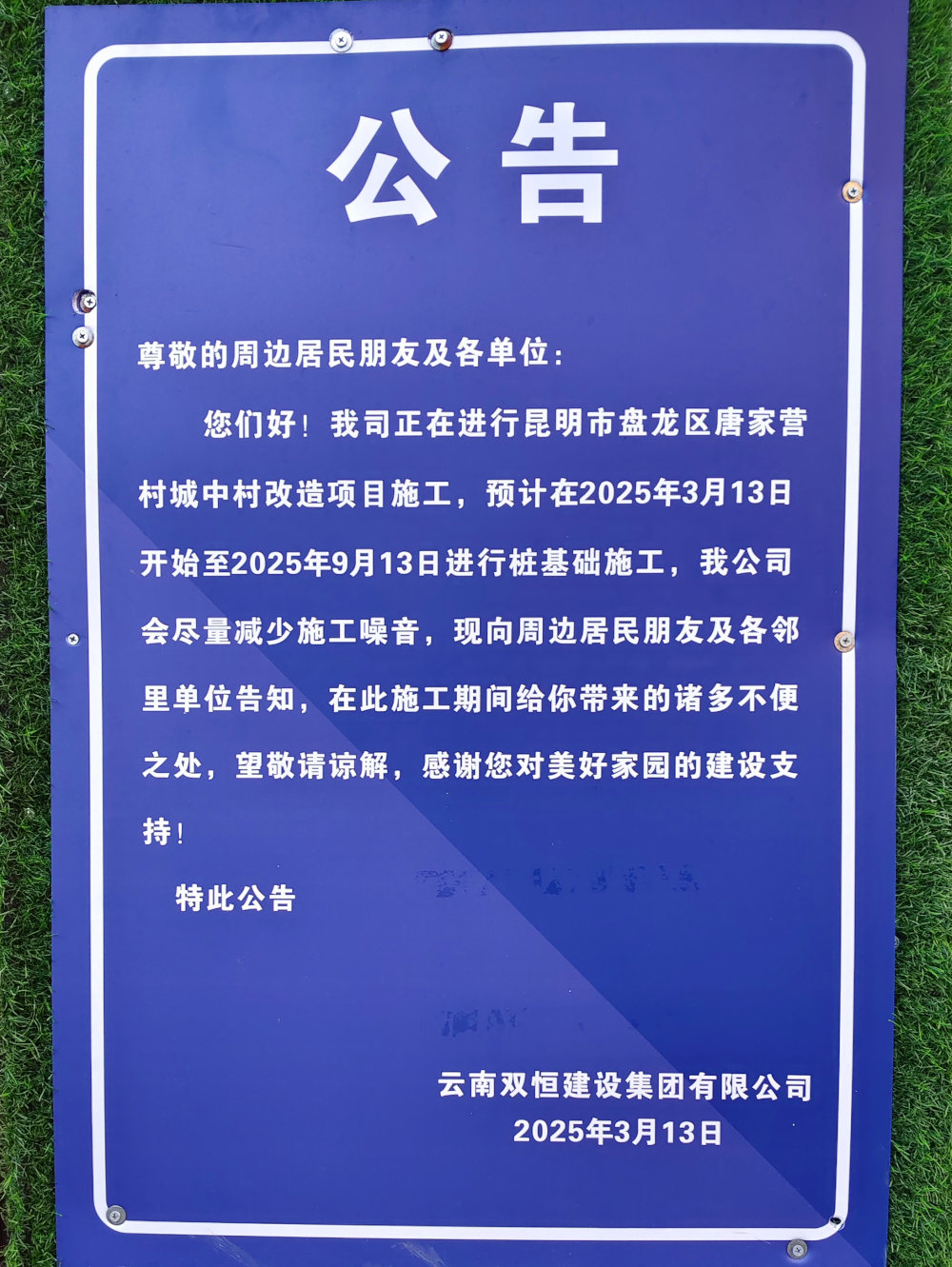 Chers résidents et voisins des environs, Nous tenons à vous informer que notre entreprise procède actuellement à la construction du projet de rénovation du quartier de Tangjiaying. Les travaux de fondation sur pieux vont se dérouler du 13 mars 2025 au 13 septembre 2025. Nous nous engageons à réduire autant que possible les nuisances sonores occasionnées par le chantier. Par la présente, nous souhaitons informer les résidents et voisins concernés que nous nous excusons pour les désagréments que cette période de travaux pourrait occasionner. Nous vous remercions par avance pour votre compréhension et votre soutien dans la construction de notre cadre de vie. Fait pour servir et valoir ce que de droit. Yunnan Shuangheng Construction Group Co., Ltd. 13 mars 2025