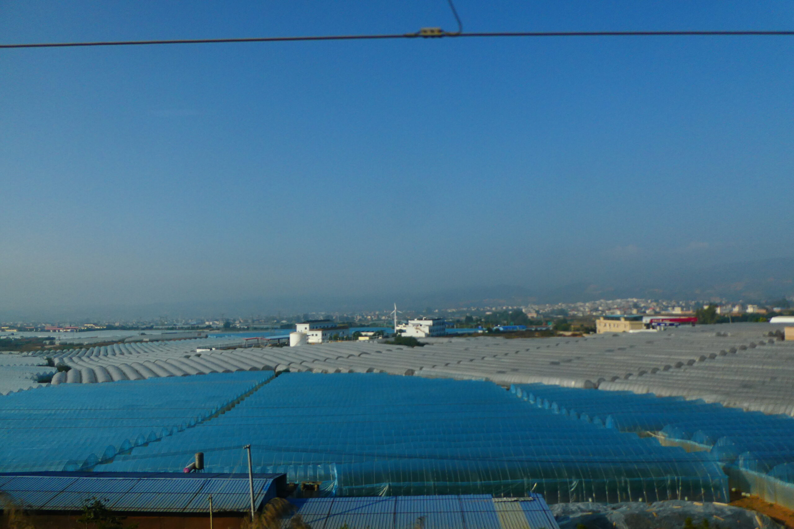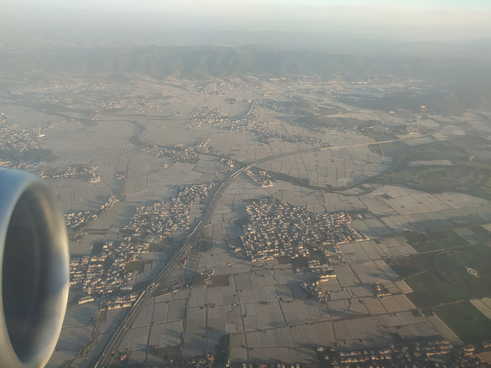 J’ai pris ces photos lors de mon premier voyage en Chine, alors que mon avion descendait vers Kunming. Ce fut un de mes premiers étonnements : que des bourgs soient ainsi cernés par un réseau serré de serres. J’ai même douté un moment que s’en fut. Mais j’en ai par la suite souvent rencontré dans le Yunnan.