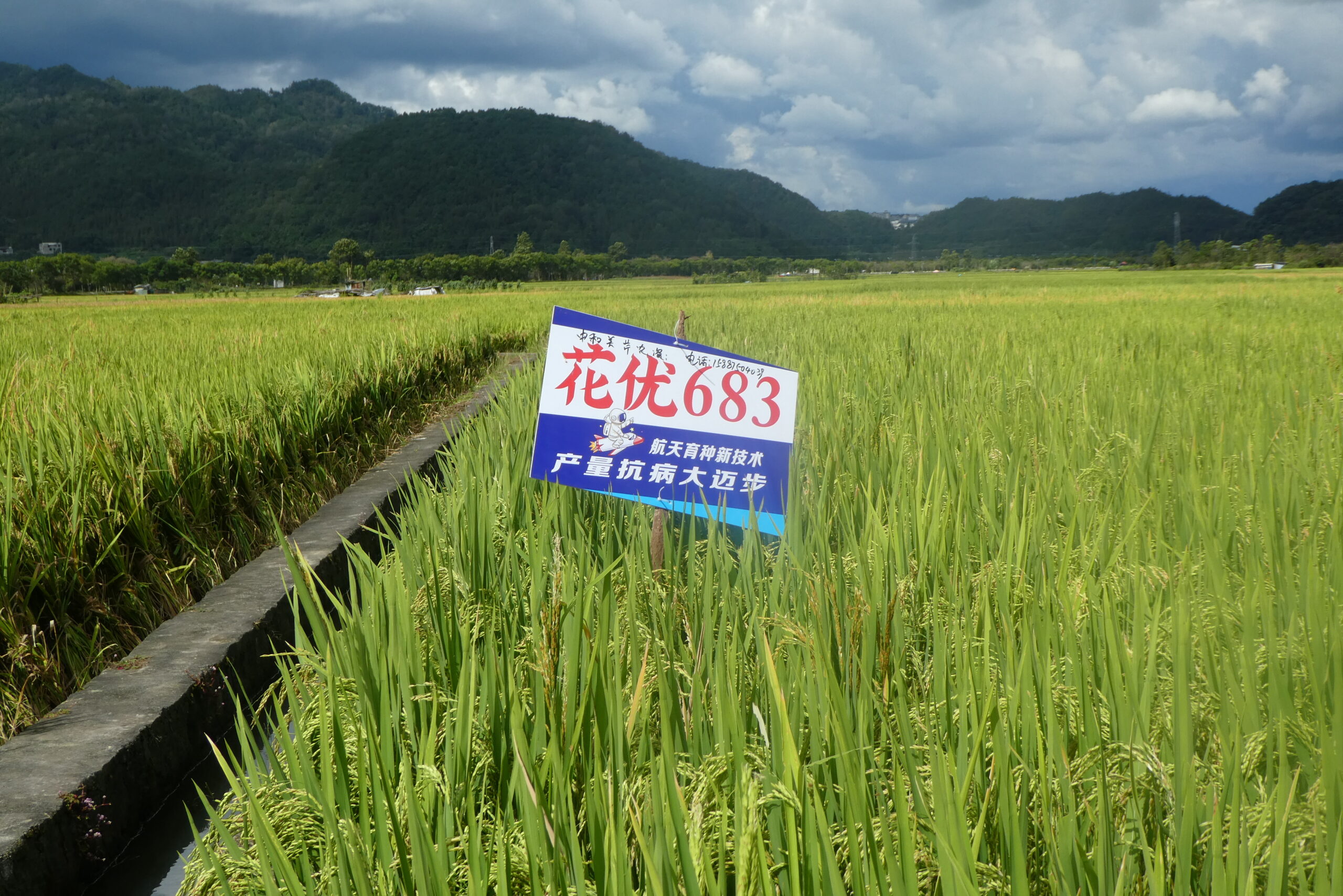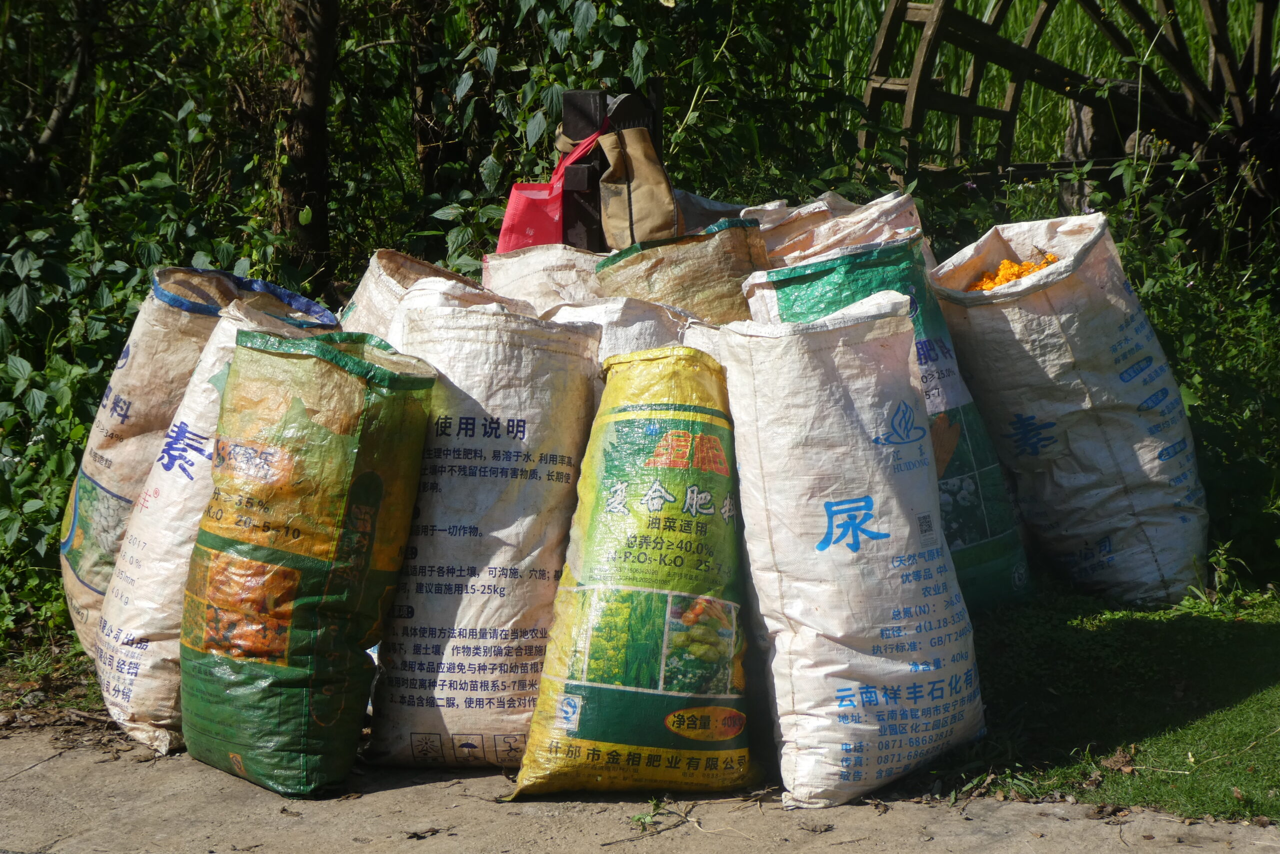 La taille des champs ou leurs pentes interdisent les grands équipements motorisés, mais pas la petite mécanisation. Dans certaines parcelles, on aperçoit des panneaux publicitaires ; ainsi dans la deuxième image du carrousel on en voit un planté par « Zhonge Meian », un agrofournisseur, qui proclame que « Huayou 683 » est une semence issue d’une « nouvelle technologie de sélection spatiale » qui fait faire à la production de riz un  « grand bond en avant en rendement et en résistance aux maladies ». Certes ici (troisième image) les sacs d’engrais sont de la récupération pour stocker une récolte, mais ils attestent d’usages locaux en matière de fertilisation. Enfin, j’ai croisé une équipe d’ouvriers agricoles à Shilin Naigu qui aspergeaient les pousses de colza d’une protection phytosanitaire…