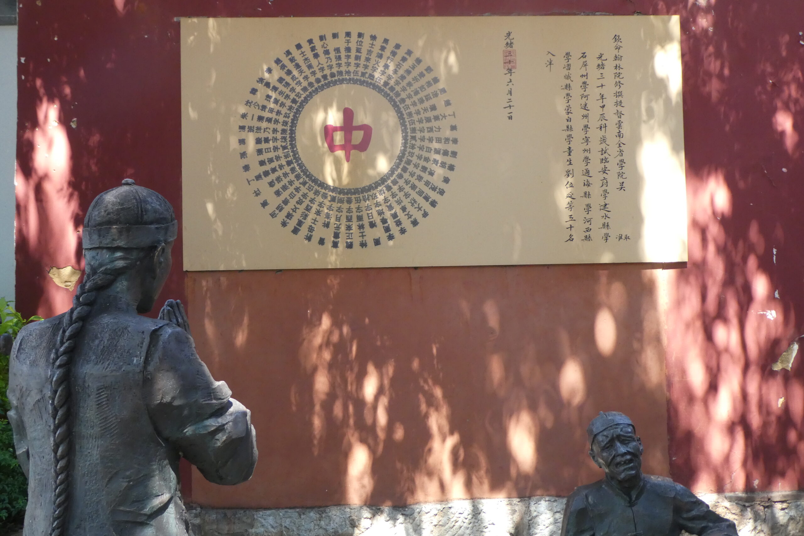 Cette « passion » est probablement le rejeton de la tradition multiséculaire de sélection des fonctionnaires par des examens dont les difficultés et la concurrence allaient croissantes, des échelons locaux jusqu’au niveau national.  Dans plusieurs villes, j’ai pu visiter des centres où avait lieu ces examens. Voici à Jianshui [4], une ville du Yunnan, les sculptures qui étaient installées devant l’entrée d’un de ces Centres. Elles traduisent les émotions des candidats après qu’ils aient pris connaissance des résultats, de la détresse pour l’un au défilé d’honneur à cheval d’un autre. Les noms des reçus étaient rendus publics sous forme d’un cercle avec le signe 中 en son milieu. Le premier d’entre eux voyait son nom écrit au centre supérieur  du cercle, les autres suivaient le sien, selon leur rang, dans l’ordre inverse des aiguilles d’une montre.