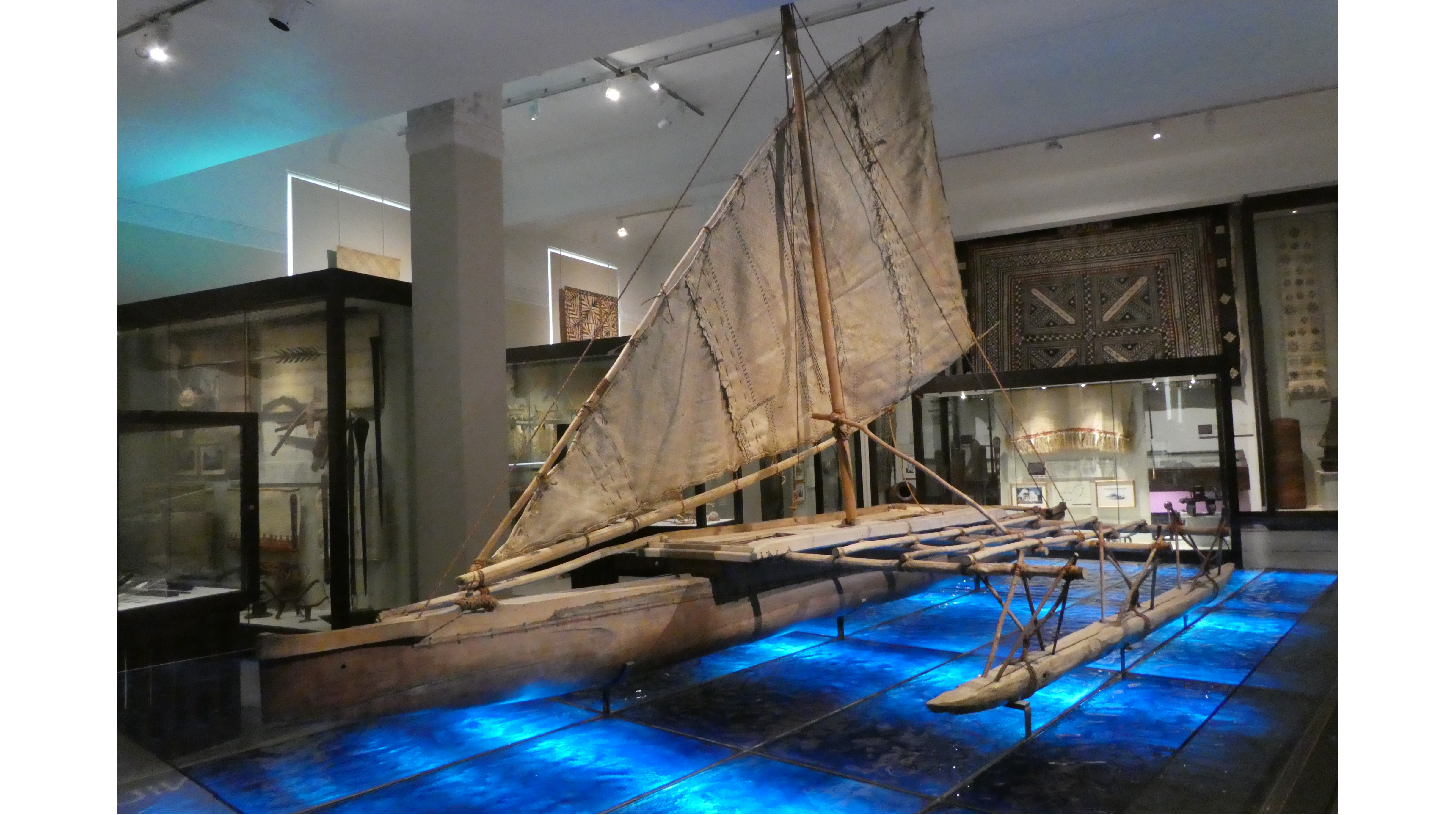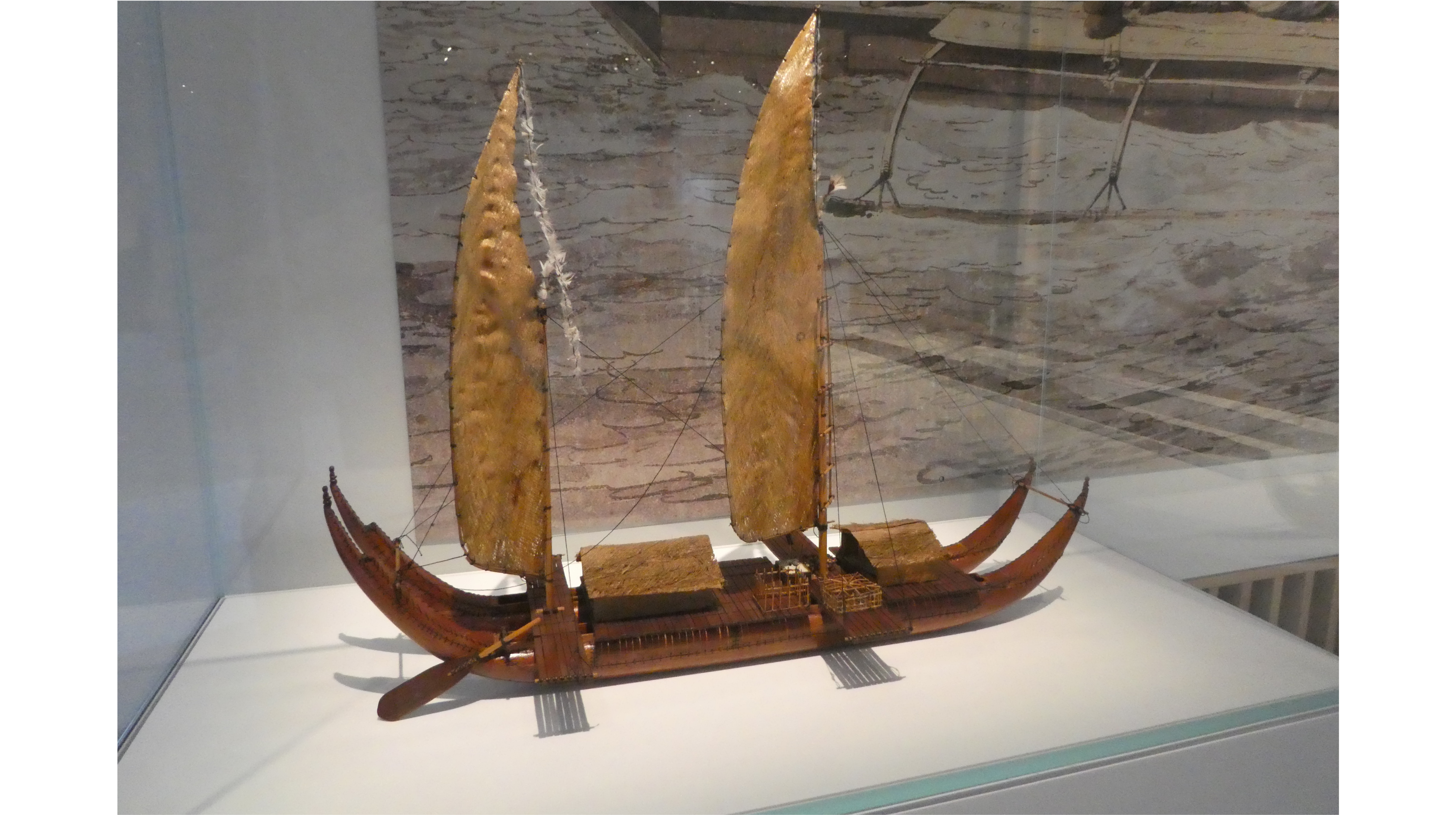 Là encore, le Musée de Tahiti apporte quelques réponses. Les plus assurées sont techniques. Ils utilisaient pour voyager en pleine mer des pirogues doubles à coque étroite, reliées entre elles par des traverses formant un ponton, qu’ils équipaient d’un ou deux mats pour porter des voiles (photo 1 maquette d’une pirogue d’expédition, Musée de Tahiti ; photo 2 Pirogue à balancier et à voile des Fidji, Musée d’Auckland). On peut imaginer qu’ils partaient en expédition avec une flotte de dizaines de bateaux, pour porter à la fois les colons, hommes et femmes, mais aussi la nourriture, l’eau, les animaux et plants domestiques dont ils avaient ou auraient besoin. Ils devaient pêcher pendant leur voyage, peut-être recueillaient-ils aussi l’eau de pluie ?
