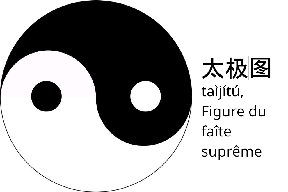 [Dans la pensée chinoise, le Yin et le Yang ne sont pas des états (féminin / masculin ; nuit / jour ; faiblesse / force ; froid / chaud…) comme on les présente souvent en occident, mais des mouvements complémentaires : tendance féminine / tendance masculine ; montée de la nuit / levée du jour ; affaiblissement/ renforcement ; refroidissement / réchauffement… Dans la Figure taoïste du faîte suprême (太极图 taìjítú) qui illustre ce texte, l’œil blanc dans le Yin noir et l’œil noir dans le Yang blanc signifient que l’un est déjà en germe dans l’autre. Le faîte suprême, c’est le sommet du toit, cette ligne critique où il bascule sur son autre versant, car jamais un versant, qu’il soit Yin (ubac) ou Yang (adret), ne monte jusqu’au Ciel ].